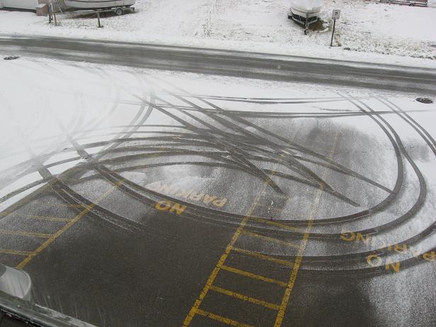 The middle one I took just a few minutes ago. I'm sitting in the library, looking out at the same harbour, which is now grey and has snow softly falling into it. I really liked the pattern that the tire tracks made in the snow in the parking lot down below. They make parts of circles, intersecting. Lines. It looks like someone with a big piece of paper just playing with form - making wide arcs with charcoal, or something. A looseness about them.